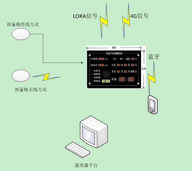 本產(chǎn)品為入戶(hù)報警器家庭版,需要配合我司雨量桶使用,系統組成應用圖如下圖所示: