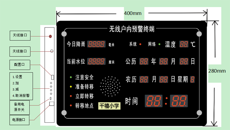 產(chǎn)品采用與家庭日常用品相結合的親民形式,具有公歷、農歷、時(shí)間、星期、溫度等居民日常常用信息的顯示功能,可提高居民對設備維護的重視程度,便于居民及時(shí)掌握預警信息。